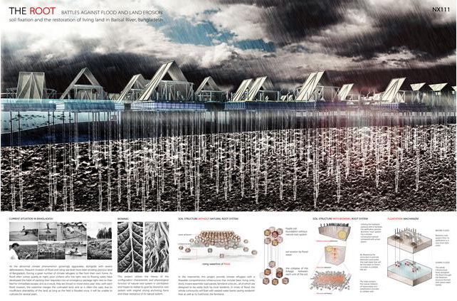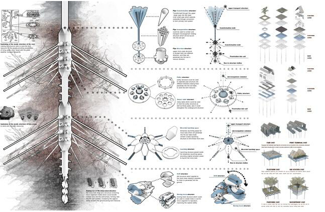 “Appropriate adjustments of buildings can be made with climate changes, so that the victims of the flood region do not have to give up their homes”, the designers said. They creatively put forward design ideas that let the bottom of buildings grow roots to continually make the soil solid. The functional conversion between the time of disaster and normal daily life can be achieved by the combination of residential units. Their bold and creative design concept and the beautiful imagination of the future architecture won the favor of the jury.