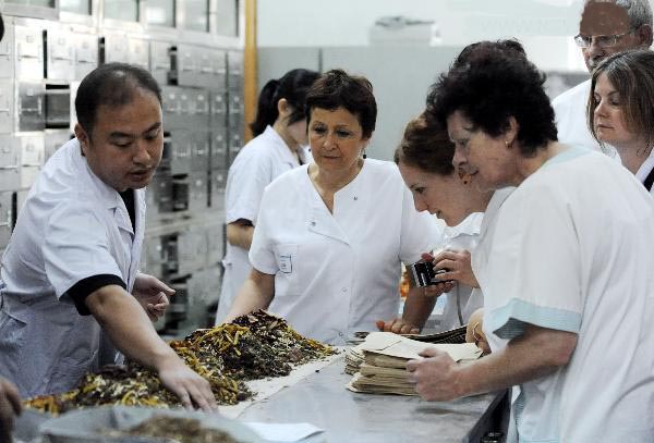 Students from France learn to identify Chinese Herbs in Shengyang, capital of Liaoning Province, Aug. 4, 2010. A total of ten French students came to Shenyang on Wednesday, and they will spend two weeks to learn traditional Chinese Medicine such as acupuncture and massage from Chinese doctors.