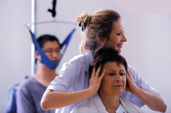 A French student practices massage in Shengyang, capital of Liaoning Province, Aug. 4, 2010. A total of ten French students came to Shenyang on Wednesday, and they will spend two weeks to learn traditional Chinese Medicine such as acupuncture and massage from Chinese doctors.