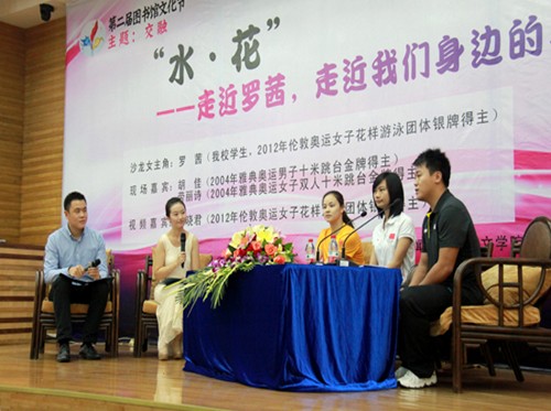 Oct. 17th—The 2nd Annual Library Culture Festival of GDUFS was held on October 14th. A meeting entitled, "Get Close to Qian Luo and the Olympic Stars Around Us" was held successfully in the basement of the north campus library. Qian Luo, who won a silver medal in the team competition of synchronised swimming at the 2012 London Olympics, was there. Two gold medalists from the 2004 Olymics held in Athens were also there, namely, Jia Hu, winner of the men’s Guangjun Sui gave a speech at the opening ceremony. He emphasized that libraries play a great role in modern society. They are not only the heart of a unversity, but also the base of the success. He expressed that the Library Culture Festival was a symbol of the development and maturity of GDUFS?libraries. He also said that the theme of this year's festival,“Blend? had a realistic significance. With the aim to develop a high-level university with international distinctive features before 2025, GDUFS needs to face different challenges and interactions to create a "blend" of ideas from different cultures. Conversing with the olympic stars, realizing their inspirational stories and cultivating their determined spirits was a perfect reflection of the theme. Youqi Shi introduced the theme of this Library Culture Festival and he shared his hopes that participants would develop a deeper understanding about the meaning of ?Blend?through a series of themed activities. Apart from the Living Library, the main activities of this festival also included the micro film competitions, academic forums, and more! The Chief Librarian, Fangfei Wu, made some illustrations about the Culture Festival. He said nowadays books are challenged by networks and digitization. That is why GDUFS held the festival, to improve the library's networks, strengthen the culture construction and promote humanistic values. Later, Guangjun Sui presented the olympic stars with souvenirs and posed for group photos. Guangjun Sui, Youqi Shi taking group photos with the Olympic athletes. The meeting was divided into three parts: 1)Getting close to Qian Luo, 2) getting to know Jia Hu and Lishi Lao, and 3) having a time for questions and answers. Throughout the event, the library played a video of Qian Luo’s competition in London and an interview from her teammate XiaoJun Chen. Audiences also reviewed her photos at various periods. About how to balance training and study, Qian Luo expressed that though tired, she found a good balance beween these two necessities. Her teammate mentioned in the video that Qian Luo had never asked for leave because of illness or injury. Lishi Lao also said that because of sports, she became strong minded and learned how to deal with things in a better way. Laslty, Jia Hu said he believed that success was not far away, which helped him to persevere through his hardships. Jia Hu answering the questions. The audiences took an active part in the question-and-answer portion and the three Olympic champions replied to the audience's various questions. Before the opening ceremony, Party Secrety Guangjun Sui met the three Olympic stars in the Yunshan Station and he shared his hope that all of them would enjoy the university life and be able to share their experience with GDUFS students after graduation. Guangjun Sui and Youqi Shi giving a tea reception to the three Olympic athletes.
