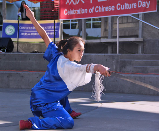 The outdoor events featured the lion dance, Chinese folk music, folk dances and Shaolin Kung Fu show. All distinguished guests including Mr. XuYongji, Chief Consul for Education at Chinese Consulate in San Francisco, Mrs. Margaret Chiu, Assistant Superintendent of the San Francisco Unified School District, artists from Bay Area, and senior administrators from SF State attended the opening ceremony and conveyed their congratulations. Mrs. Margaret Chiu appreciated the worthwhile contributions made by Confucius Institute at SFState. Chief ConsulXu appreciated contributions to promotion of Chinese Language and culture made by Director JiaxinXie and his team of the Confucius Institute. Mr. Jay C. Ward, Associate Director of Office of International Programs, thanked the Confucius Institute for organizing such a wonderfully successful “Chinese Culture Day”. When the young dancers presented their Silk Dance, their beautiful movements and the elegant silk were too overwhelming for the eyes to take in. The focus expression on the little actors met with universal applause from time to time. The sound of gongs and drums led Shaolin Kung Fu show to the climax ofthe atmosphere. The masters with unique skills, their snake and crane- style boxing, and all movements attracted audiences who enthusiastically interacted with those masters before the end of the performance.