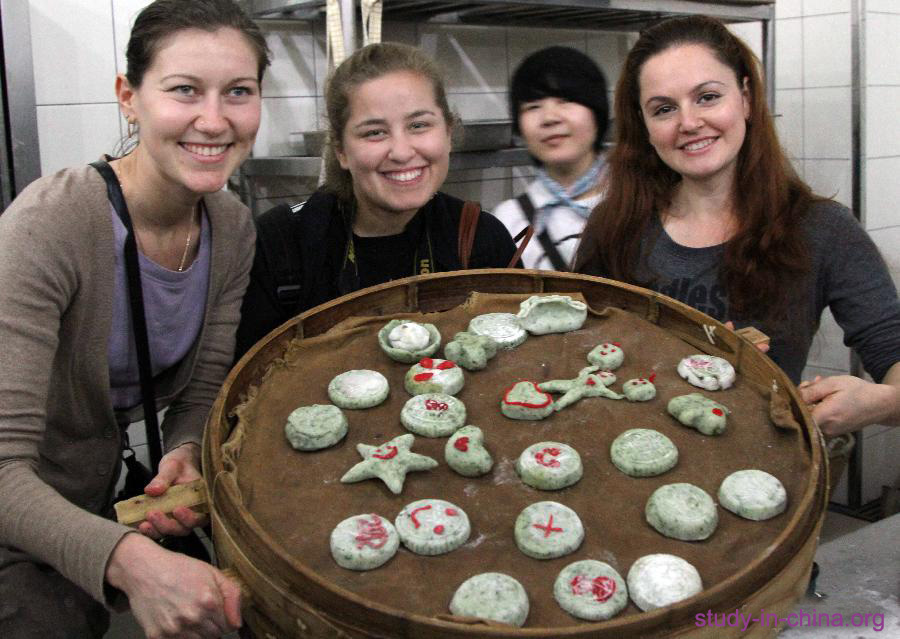 Foreign students make festival food for the upcoming Qingming festival, or Tomb-Sweeping Day, in Zhejiang Normal University in Jinhua, east China's Zhejiang Province, March 30, 2012. Some 100 foreign students of Zhengjiang Normal University on Friday learned to make the Qingming food to show their interest in the Chinese traditional festival.