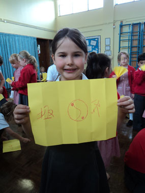 Because there were no enough Tai Ji fans, the students had to make some fans by themselves. They drew Tai Ji symbols, the Chinese National flag, or wrote a few Chinese characters on their fans. So they could try the real fans one row by another, while the left kids might still have something in their hands.