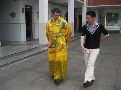 In addition we were also given the opportunity to try out to wear some of highly traditional costumes. What a picture that made seeing myself in an emperors garment! As I was the only male student among the four foreigners I, of course, was the emperor and the girls were my wife & concubines. My only problem, however, was that I could never decide who of them was to be my wife and who my concubines.. Yet, in any case, my female colleagues all seemed to not be too happy about the question I faced anyway. Several photos were taken of ourselves and many more together with the children outside. Furthermore, we were also taught some traditional dances by some teacher which we tried to imitate, yet, in my opinion, only with very limited success. But I think we and the children all enjoyed it a lot.