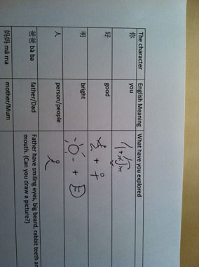 Observation, imagination, analysis let the students develop their own creative ability, practice writing and enhance their memory. At the same time, the students' enthusiasm for learning Chinese characters got highly increased. For example, some students described the character爸as the two points on the Chinese character for "father"(爸) like the smiling eyes; the following tow sweeping strokes like father's beard; "ba"(巴) like a laughing open mouth with two rabbit teeth. Childish as they are, they were actually used their thinking skills effectively.