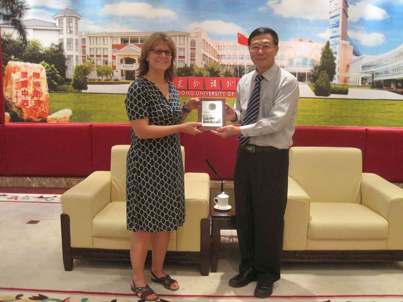 On July 23th, President of TESOL International Association Dr. Suzanne Panferov visited GDUFS, where she was received by Vice CCP Secretary Chen Jianpin and other school officials. It is reported that the 2013 TESOL Annual Conference will be held in GDUFS next year. In the talk with Suzanne, Chen first introduced what GDUFS has achieved in linguistic studies and English teaching, citing examples of high employment rates and successful promotion of advanced teaching approaches. Suzanne expressed her satisfaction with the academic competence as well as the comprehensive teaching facilities of GDUFS. She promised to give her support and strongly believed that GDUFS could host the 2013 TESOL Annual Conference successfully. At the end of the meeting, Chen extended thanks to Suzanne for her support and promised to seize the opportunity to promote further communication between Chinese and overseas English teachers.