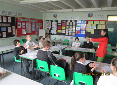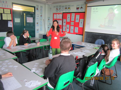 They put the students in China of literacy class into Chinese zodiac named group, assigned to the classroom of the different learning experience.XieQiongFang teacher accept the dragon, snake, horse, sheep four groups of students, school requirement each group of course covers greetings, Numbers, and family members content, punctuated by the game interaction and singing activities. Start from morning 9:30 , students take turns learning experience, teachers must teach four hours of course, at 2:30 p.m. to end. Although tasks are very heavy, but teachers were ready befor, so quickly into the role. XieLaoShi's first class is Year-11's students, relatively junior students experience, accept ability, tow of them students have been to China, a strong interest in the culture of China. XieLaoShi introduced herself to naturally from asking people imitate say \"hello\" with the Chinese language and introduced family members, wants everyone to guess lucky numbers in China and unlucky numbers, and introduces the architecture of digital Beijing the imperial palace in the application of the allusions.