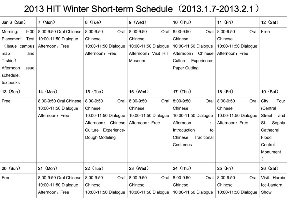 2012 Winter Course Schedule in Harbin Institute of Technology