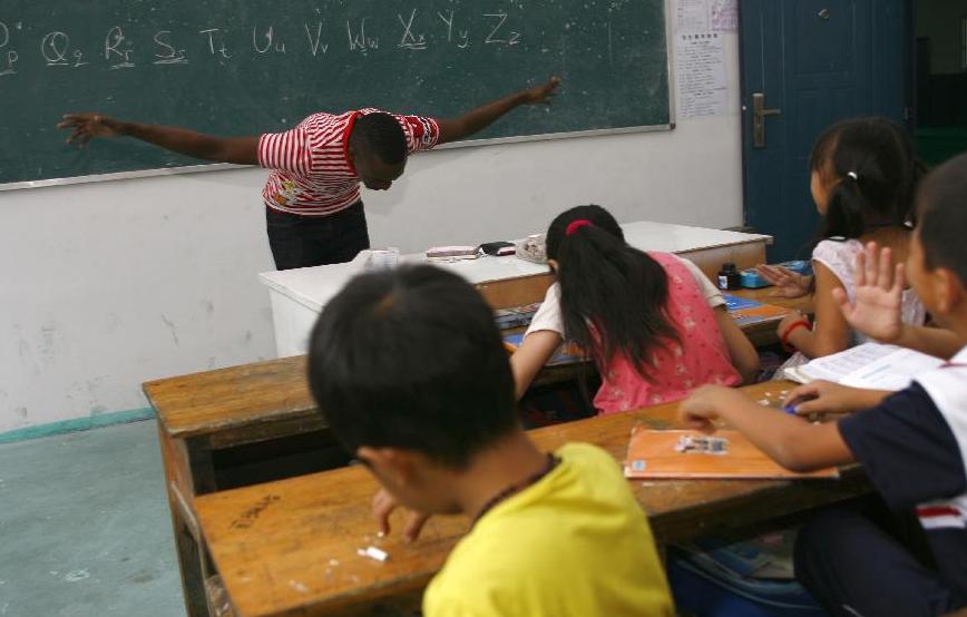 A schoolgirl looks at her foreign teacher Musasizi Isaac curiously during a class in Limin school, a school for children of migrant workers, in Jiaojiang District, Taizhou City, east China's Zhejiang Province, Sept. 13, 2012. Isaac arrived in China four months ago, and he now teaches English to two classes in this school