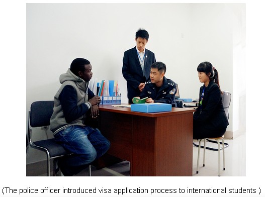 On May 3rd, 2013, the police officer from Division of Exit-Entry Administration of Shenyang Public Security Bureau, along with Shenyang TV Station Journalists visited SAU and was warmly received by Ms. Pearl, Vice Dean of International Education College.