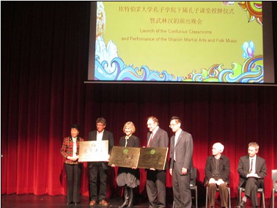 A launch ceremony of three Confucius Classrooms was held by the Confucius Institute at the University of Canterbury (CIUC) in the Middleton Grange School Performing Theatre in Christchurch on Friday evening May 10th. The three Classrooms were to be hosted by Christchurch Boys’High School, St. Margaret’s College and Unlimited Paenga Tawhiti. The distinguished guests included Madam Tan Xiutian, Chinese Consul General in Christchurch, Mr. Eric Livingstone, National President of the New Zealand China Friendship Society, Dr. Jonathan le Cocq, Acting Pro-Vice Chancellor (Arts) of UC, Mr. Paul McWilliams, Headmaster of Christchurch Boys’High School (CBHS), Mrs. Gillian Simpson, Executive Principal of St. Margaret’s College, Mr. Alastair Wells, Co-director of Unlimited Paenga Tawhiti and Mr. Xu Hengzhen, Director of International Office of Education and Chinese Language, Henan Province. Present also were Dr. Adam Lam and Prof. Hu Hong, Director and Deputy Director of the CIUC. Over 300 people attended the ceremony.