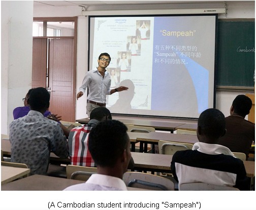 On June 18th, 2013, the Chinese language activity themed on “An Insight into Cambodia” was held in friendship villa. Cambodian students introduced their native country to faculties and other international students.