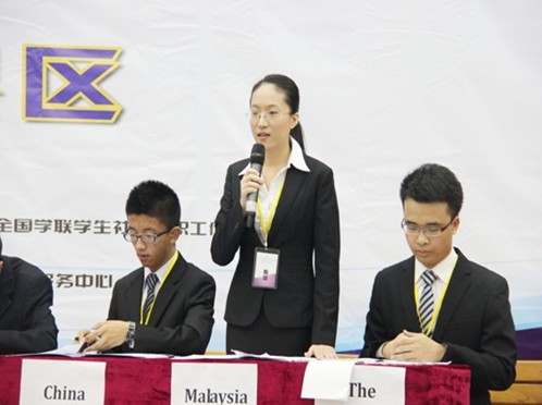 Qiao Shan, a sophomore from South China Normal University (SCNU) served as the delegate from Indonesia. Though she majors in Chinese language and literature, her fluent American English and sweet smile deeply impressed the judges and audience. In the self-introduction section, she shared her attitude: 'I love challenges, and that's why I'm here.' She offered her measures on the issue 'Improving women's productivity' in two dimensions, which are to help women promote their competitiveness and to guarantee women's rights and to build a snug working atmosphere.