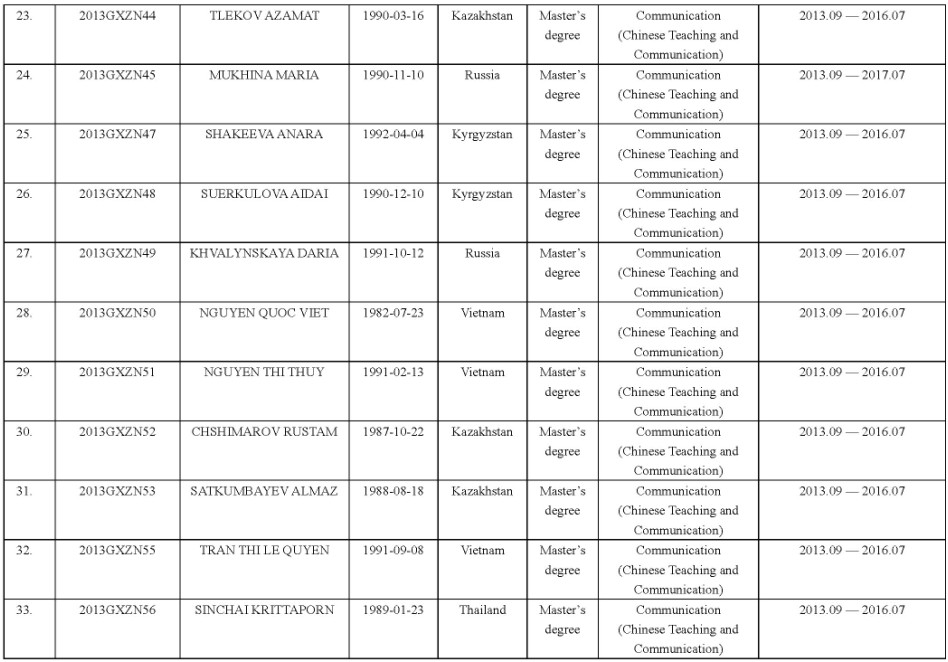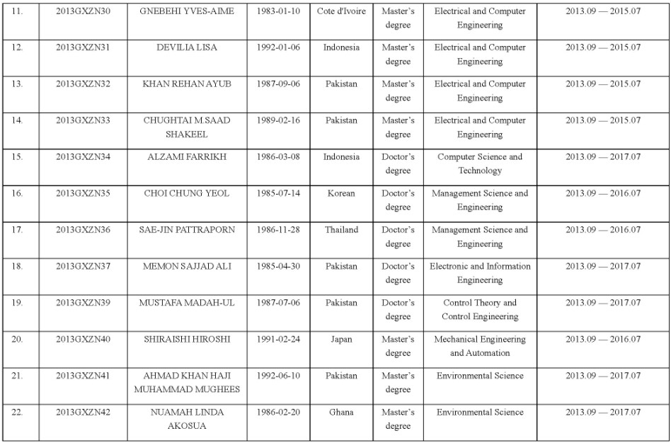The Name list of Chinese Government Scholarship at SCUT in 2013