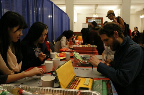 In the afternoon, teacher volunteers of CI-Pitt displayed various kinds of traditional Chinese arts such as paper-cutting, tea ceremony, Calligraphy and classical hairstyle designing. An American student who is studying Chinese rushed into Calligraphy exhibition stand. He explained that he is very interested in Chinese culture especially Calligraphy and wrote down his Chinese name “Jie Sen” with Chinese writing brush immediately after one of the volunteer teachers showed him how to do it. Jie Sen told us that he felt so excited to actually take part in celebration activities of Chinese New Year after watching them on TV. Everyone was amazed at the extensive and profound Chinese culture, laughing and enjoying the New Year celebration. Directors of CI-Pitt Ms. Michelle Heryford and Chinese Co-director Ying Xiao had cordial talks with some of the guests and wished everyone a Happy New Year.