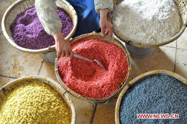 Locals make five-color rice to greet upcoming Qingming Festival in Guangxi(2011/3/30 0:00:00)