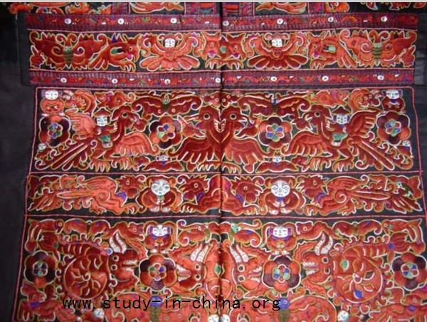 This drawing narrates the history of a new war in the old times. Miao people's clothes, anyway, always show special esteem for the butterfly, the bird Jiwei and our heroine Wen Maoxi. And their images are always in our clothes. Our legends tell that a star fell in the roof of her house. After three days, she was born of her mother. She grew very quick and she married a young.